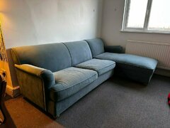 We are moving home so we need to clear stuff for the 29th, so that means that most of the items published will need to be taken preferably close to this date (subject to discussions and offers). We are open to offers and I have more pictures of each item, so do not hesitate on PM me. Sizes are in CM. - Blue velvet L shape sofabed with storage: 260 x 78 x 90/170 (bed is 190 x 135 x 12): £300 - Mattress (perfect for the sofabed): 190 x 135 x 12 : £20 - Cushions + covers: 56 x 37 and 46 x 46 (4 in total): £10 - Samsung Smart TV 55" UE55NU7100: £150 - Black clothing rack: 68 x 185 x 33: £20 - Double bed Wooden white bed frame + mattress: 150 x 110 x 205: £70 - Bedside tables x2 (one is chipped on one side)+ lamps: 45 x 60 x 40: £20 Extras: - Scrabble boardgame (never used) + fortnite Monopoly: £5 - Tigerino Nuggies Natural Clay clumping litter (14l + 10l): £5