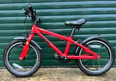 This is a great value aluminium bike which has a lightweight high quality frame and forks. Suitable for riders aged 4-5 years old with a minimum inside leg of 48cm. Mechanically good and recently serviced, it is ready to ride. It has been used by 2 children so cosmetically the bike is ok but not perfect, it has a number of scratches and chips to the paintwork and scuffs to the saddle and brake levers. Collection is from Camberwell SE5, near Denmark Hill station. Specification Frame: Aluminium 9.5" Frog 48 Frame Forks: Aluminium Rear Derailleur: n/a Shifters: n/a Chainset: Alloy 102mm cranks 32T chainring Bottom Bracket: 116mm Sealed Bottom Bracket Freewheel: 16T Headset: Locking headset, 27mm Stem: Frog Bikes Aluminium 35mm Stem Handlebars: Frog Bikes Aluminium Little Handlebars Width 440mm Front Brake: Tektro C310 Aluminium V Brake Black Rear Brake: Tektro C310 Aluminium V Brake Black Brake Levers: Tektro Aluminium JL352-RS V Brake Lever Black Rims: Aluminium 16" x 1.5" 20 holes Black?Weight:240g? Front Hub: Aluminium 20 holes Rear Hub: Aluminium 20 holes Tyres: Kenda 16" x 1.5" hybrid tyres Saddle: Frog Bikes Saddle Size:201*136mm, Black, adjustable rails for better fit Seatpost: Aluminium 200mm, 27.2mm wide. Quick Release on old spec only Pedals: Plastic with Ball Bearings and Reflectors Grips: Frog Bikes Specific Locking Slim Grips Miscellaneous: Plastic Mudguards front and rear