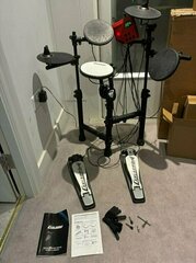 “The Carlsbro Club100 is a 5 pad, 2 pedal, small footprint electronic drum kit. Featuring one snare pad, two tom pads, one cymbal pad, one HiHat cymbal pad with a foot controller pedal and one bass pedal. This simplified kit is perfect for younger drummers and beginners, but also for drummers looking to save space in the studio or use as a practice aid that is very compact and easy to transport.” https://www.carlsbro.com/electric-drum-kits/club-100/ Usually sold for around £200+ new. This drum kit, which is in good condition, has served our son very well as a starter kit. Comes with instruction manual, and adjustment tools. Note - does not include drum sticks or stool. Headphones work in one ear only but any standard corded headphones work. For collection from Camberwell SE5