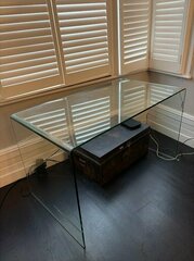 Sleek modern waterfall coffee table made from a single piece of bent tempered glass. The clean, minimalist design makes it a versatile piece that works well in contemporary, modern, or minimalist interiors. The transparent glass creates a light, open look and pairs easily with any decor style. Size - 125x70 Details Thick tempered glass One-piece waterfall design Clear polished edges Modern minimalist style Great as a desk Perfect for a living room, office, or studio space. Condition: good - used well so has fine scratches on the glass. Price - £80 (open to sensible offer)
