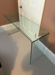 Sleek modern waterfall hall table / bureau made from a single piece of bent tempered glass. The clean, minimalist design makes it a versatile piece that works well in contemporary, modern, or minimalist interiors. size - 125 x 40 The transparent glass creates a light, open look and pairs easily with any decor style. Details Thick tempered glass One-piece waterfall design Clear polished edges Modern minimalist style Condition: Very good Price: £55