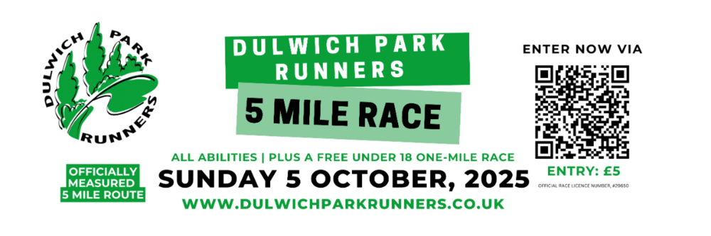 An opportunity to test yourself over 5 miles. Perhaps you've been doing 5k and would like to go a little further? Or would you like to challenge your 5-mile PB? All abilities welcome. The event takes place in Dulwich Park and the surrounding streets. (It's not just 5 laps of Dulwich Park!) Organised by local running club, DULWICH PARK RUNNERS Only £5.00 entry Reg