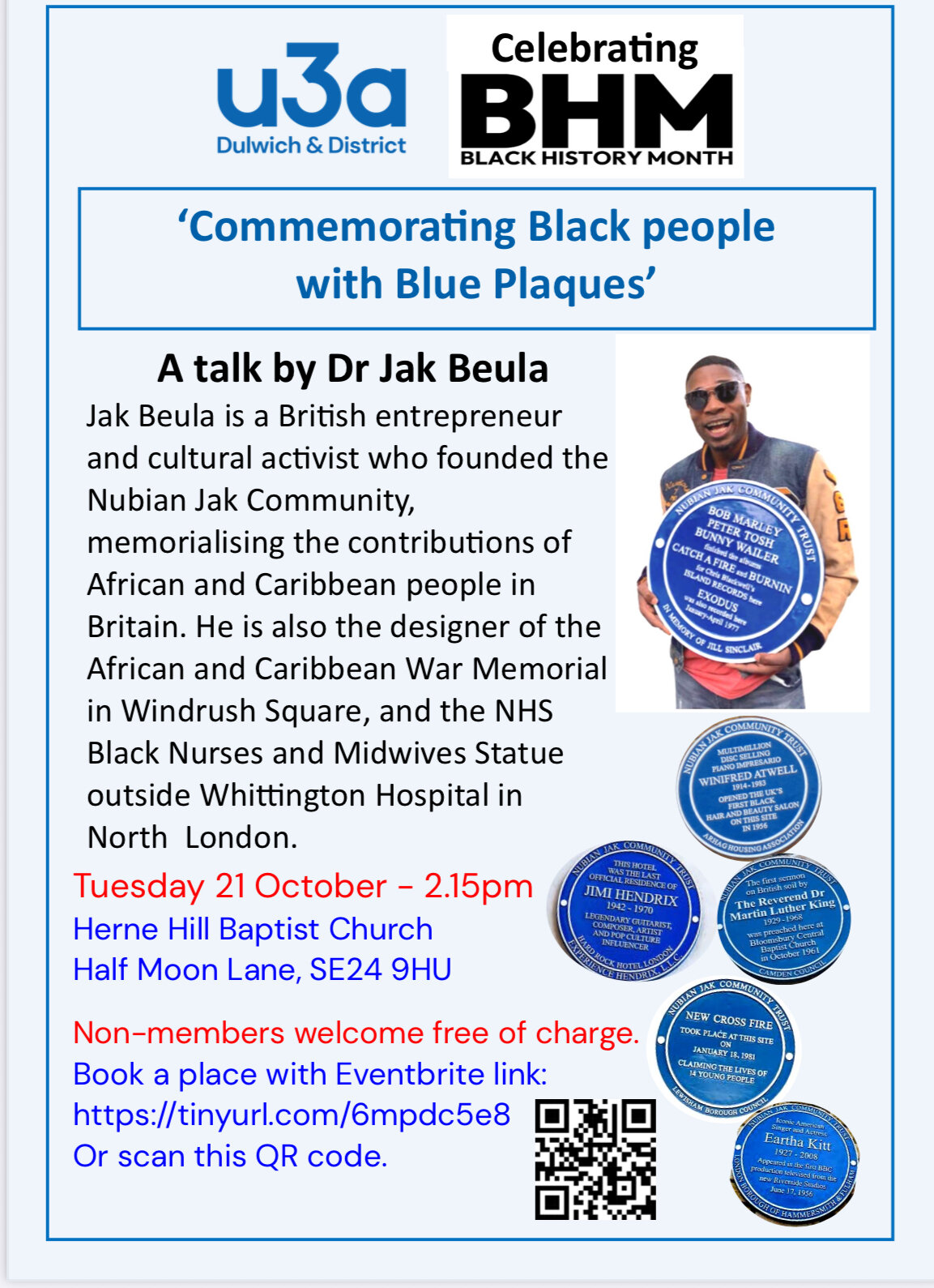 Dulwich & District u3a, Black History Month free public event on 21st October 2.15pm. Dr Jak Beula will be speaking about ‘Commemorating Black People with Blue Plaques’. Jak is the designer of the African and Caribbean War Memorial in Windrush Square and the NHS Black Nurses and Midwives statue outside of Whittington Hospital in North London. D&D u3a is part of a nation-w