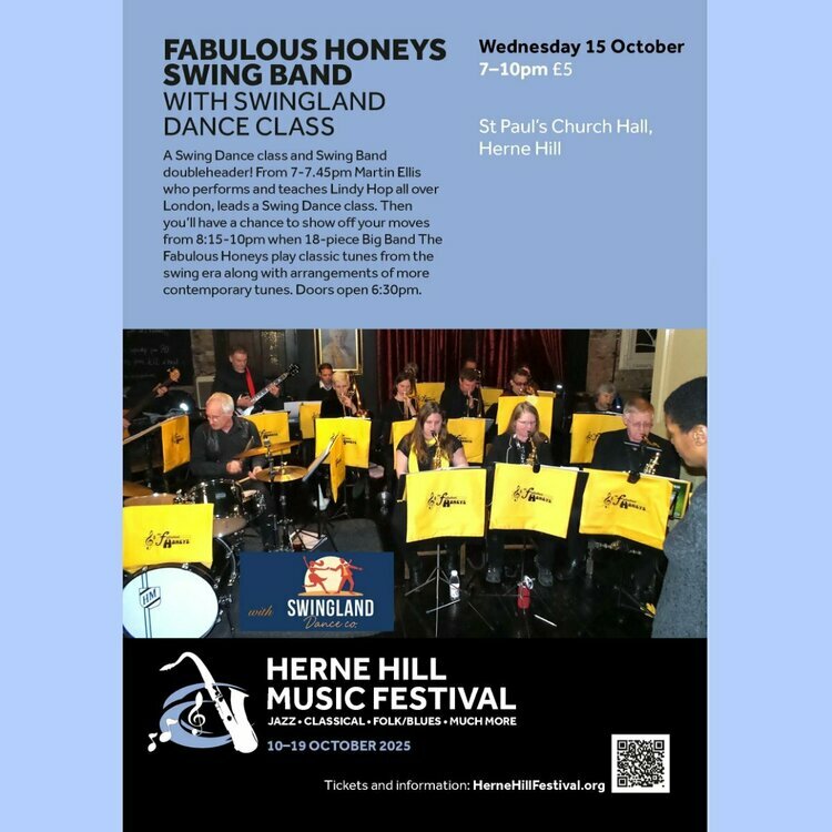 As part of the Herne Hill Festival, the Fabulous Honeys are playing at St Paul's Church Hall, 129 Herne Hill Road. 7-7:45pm swing dance lesson, followed by the band playing. Tickets and more information www.hernehillfestival.org. £5, children free,