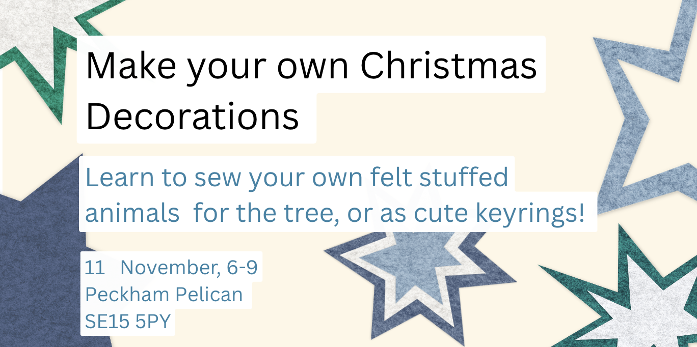 Come and join this festive workshop from Craft Corner and learn how to make your own stuffed felt animals to decorate your Christmas Tree! Welcome to craft corner! Join us at The Peckham Pelican on November 11 at 6:00 PM for a fun-filled evening of crafting! Get into the holiday spirit by creating your very own festive decorations out of felt. No experience necessary - just bring your