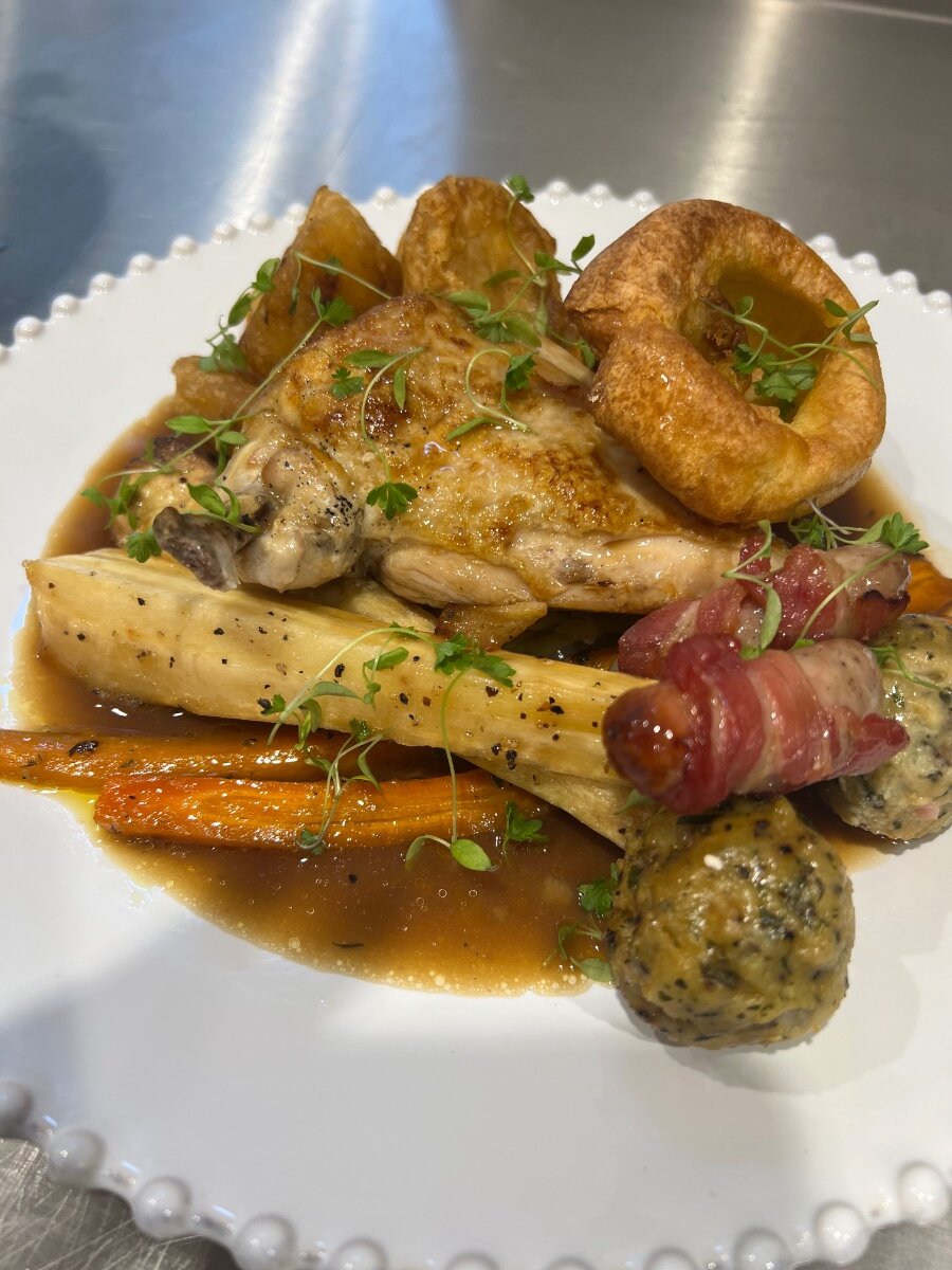 Two course Sunday Roast Lunch - set menu with Roast Chicken main, and Cobbler for dessert! All mains come with Roast Potatoes, Carrots, Parsnips, Cabbage, Leek + Cauliflower Cheese, Piglets In Blankets, Sage + Onion Stuffing, Yorkshire Pudding and a jug of Gravy.