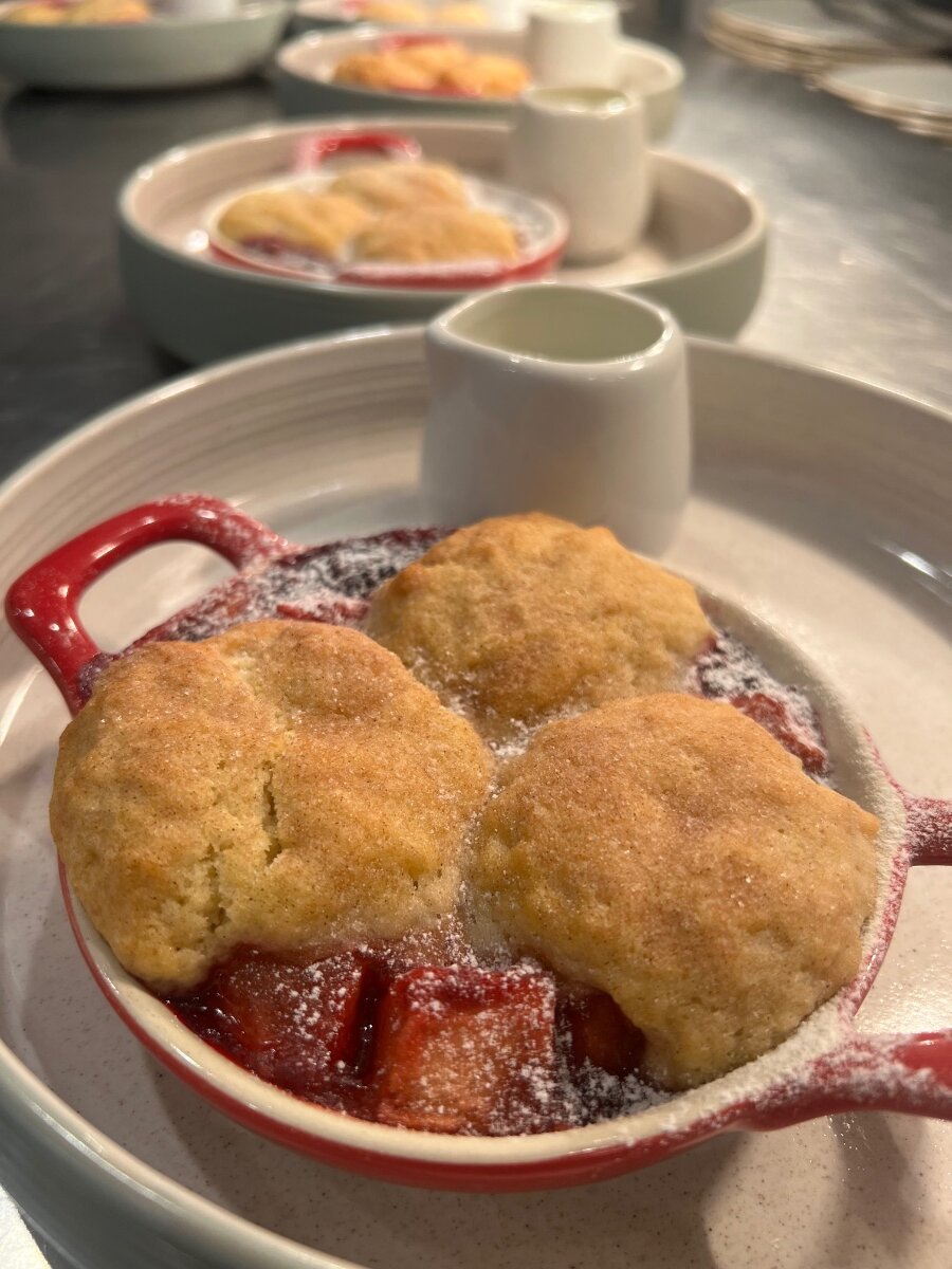 Dessert is Apple + Blackberry Cobbler, with jug of Custard!