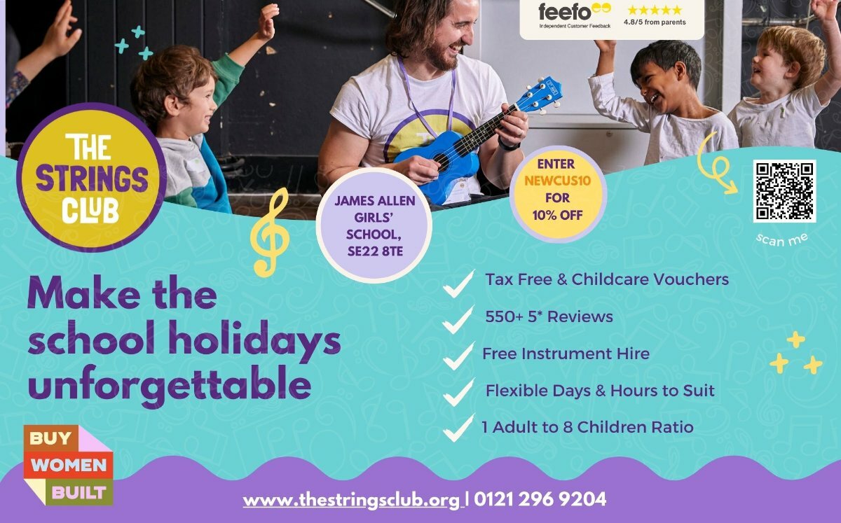 Founded by mum and award-winning businesswoman Amy Cunningham, The Strings Club offers trusted, Ofsted-registered holiday childcare with a musical twist. Mornings include guitar, ukulele or violin sessions led by expert teachers, with FREE instrument hire included on 2+ day bookings. Afternoons are filled with carefully curated workshops spanning sport, drama, dance, art and wellbeing.