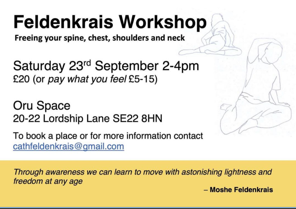 Relieve pain and stiffness and move with greater ease and flexibility through Feldenkrais. My partner recently ran Feldenkrais classes in West Dulwich which went very well but were a bit off the beaten track for East Dulwich so she is doing a special one-off at Oru Space, 20 Lordship Lane, on September 23, from 2pm - 4pm, with the aim of doing more locally in the future. Join for this special one-off class, no experience necessary. Email [email protected] for further info or see picture attached.