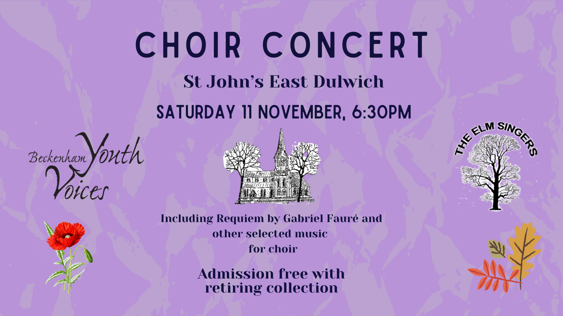 St John's East Dulwich is very pleased to host this joint concert by Beckenham Youth Voices, The Elm Singers and St John's Choir. The evening will include Gabriel Faure's Requiem plus a variety of other music for choirs. Refreshments will be served during the interval.