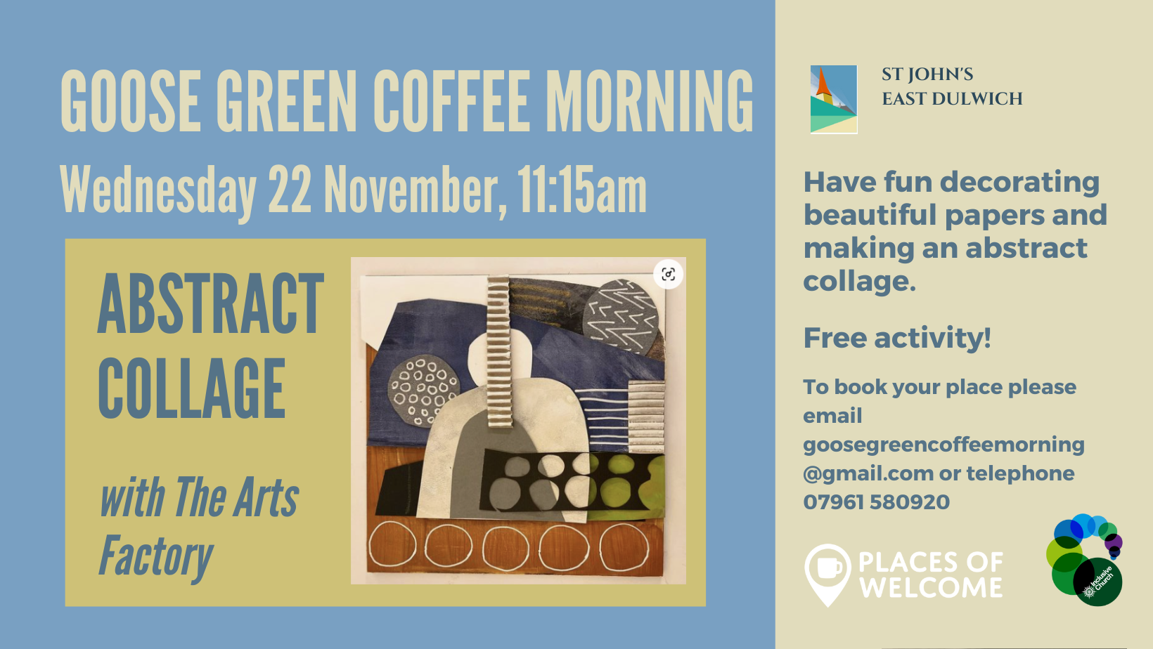 Goose Green Coffee Morning is delighted to be hosting this free session lead by The Arts Factory. You will be embellishing beautiful papers which you will then use to make your abstract collage. This is sure to be a thoroughly enjoyable creative activity. If you would like to join the session, please email [email protected] to reserve a place. Places will be allocated on a first come, first served basis.
