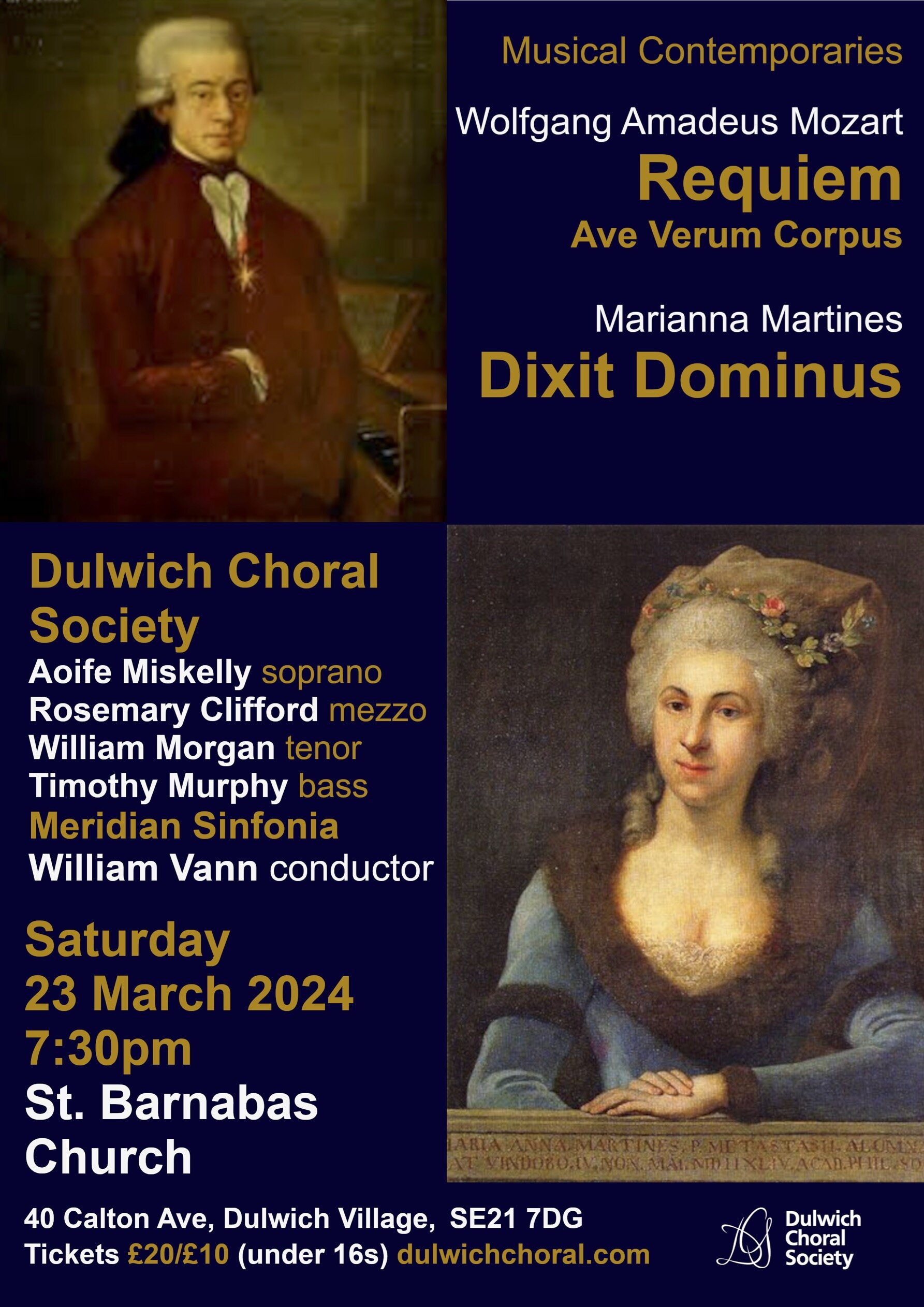 Join us for a performance of Mozart's sublime Requiem and the revelatory 1774 Dixit Dominus by Marianna Martines in St. Barnabas Church, Calton Avenue, Dulwich SE21 7DG at 7.30 p.m., with orchestra and soloists. Tickets £20/£10 (under 16s) at the door or dulwichchoral.com