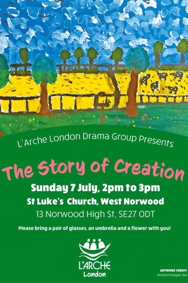 L'Arche London’s drama group are reviving their popular, immersive performance taking you through the seven days of creation. Be a part of the fun and join us during the first Feast of the year. Bring an umbrella, a flower and a pair of sunglasses and be ready to dance to the rhythm!