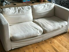 1. Moving house and wanting to give away this sofa! A little sunken in the middle but very comfy. Signs of wear over the years. Cushion covers can be removed and washed.
