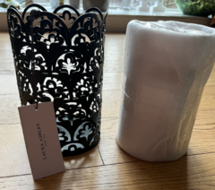 3. "Classic hurricane with clear hammered glass drum surrounded by intricate metalwork featuring Laura Ashley Musica pattern, finished in gilded bronze." Material: metal and glass Dimensions: 26cm x 17cm x 17cm (HxWxD) Selling for £15. RRP £44 Collection only from Honor Oak Park (1 min from station)