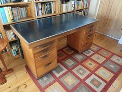 1. I have had this office desk since 1990 and it was old then. Stamped underneath as being from the London County Council which was abolished in 1965 I believe. Very solid, eight drawers. All wood apart from the two rear metal legs. Pedestals are not attached to top but legs are. Measures 60" x 30" and is 29" tall. £100. Open to offers. You will need two people and a large car or van.