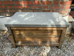 5. Waterproof wooden & metal outside storage unit with Abus Titanium lock Dimensions: 79cms wide/long 44cms deep 49 cms high at the back & 44cms high at the front (sloping roof) This has been outside for several years storing wood and has been perfectly dry throughout the year. Collection from London SE21
