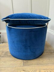 4. Tuffet and Co. footstool in blue velvet with brown leather handles, with matching cushion and both with light blue piping. Filled with sustainable wool 35cms high x 45cms across Collection from SE21