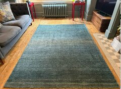 1. Hand-made in India. 75% wool/25% viscose. In good quality rug so is still in good condition after being used for a few years. Very happy to show anyone interested, address is SE21 8LT
