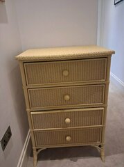 5. This is a characterful chest of drawers. A label on it has the brand 'Lloyd Loom' and it says 'British hand made woven furniture'. Wooden with a kind of woven material, like rattan. Sturdy and well made. The drawers run well. 70cm width 50cm depth 102cm height There is a small headboard that can be attached to the back. There is also a sheet of glass that can be fixed to the top, if required. £45. Collection from Whateley Road in East Dulwich, SE22. The drawers can come out. The chest would fit into a normal car, with back seat down.