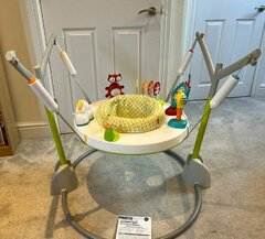 Skip Hop Jumperoo, suitable for 4 months plus (until walking). Engaging woodland themed attachments that can be moved around or removed, plus lights and sound in the bounce counter (also has a silent setting).