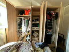 1. Free to collect as we don't have a car. If no responses, will be left outside Osprey House on the Pelican Estate from Sunday 7th Sept around 2pm. Large wardrobes, one is 3 sections (with top shelf, hanging bar, shelves and mirror) and one with 2 sections (hanging bar, top shelf). W: 138cm + 93cm (2 separable units) H: 219cm D : 56cm Used but in decent condition, will dismantle to get out of the flat, so easier to transport and reassemble in a room.