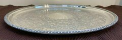 This circular tray features intricate silver plating on a copper base. Made by Barker Ellis, a manufacturer of silverware and electroplate ware dating back to 1802, it is perfect for serving drinks. There are some light scratches on the undecorated area in the centre of the tray, but it is otherwise in very good condition, with no plate loss or structural damage. With a crystal decanter and glasses, it would make an elegant addition to any household. Diameter 31cm (12.25”) Depth: 1.5cm (0.5”) Price: £22.99 or best offer (cash only) Available to collect from Clapham area