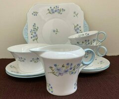 The Shelley Potteries produced some of England’s best bone china. The company’s formula contained a higher percentage of ground bone than any other manufacturer, which resulted in china that is both very thin and surprisingly strong. This exquisite tea set for two in Blue Rock pattern number 13591 was made c.1955. It consists of two teacups and saucers, two 6” tea plates, a milk jug, sugar bowl and cake plate (8¼” x 9½”). Shelley produced cups in many shapes and sizes. The cups and sugar bowl included here are made in the Regent shape. All nine items are in excellent condition, without any chips, cracks or crazing. Collection from Clapham area and cash payment required