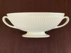 This is a beautiful Wedgwood of Etruria & Barlaston oval vase, made in the 1980s from white ceramic, and featuring two handles with a fluted ribbed bowl on a raised, footed base. It is marked on the base with the Wedgwood of Etruria & Barlaston stamp. The vase is a fine example of classical Wedgwood craftsmanship in very good condition, with no chips, cracks or crazing. Dimensions: 30cm long (from handle to handle); 10.5cm wide; 10.5cm high. Cash payment and collection from Clapham area required
