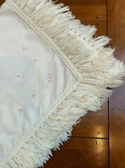 This beautiful cream cot blanket dates from the late 1950s and is a rare find. It's made of 'original' Viyella (a mixture of 55% fine merino wool and 45% long-staple cotton blended in a traditional twill weave). Developed in England in 1893, Viyella was the world’s first patented material and soon became renowned for its softness and durability. The blanket measures 140 x 140 cm (55 x 55 in). It has a woollen fringe around all four sides, and each corner is decorated with flowers embroidered in a delicate pink and cream pattern. It's in mint condition. Cash payment and collection from Clapham area required