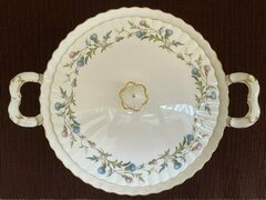 Royal Albert produced the Brigadoon pattern, featuring a blue and purple thistle on white porcelain with gilt edging, between 1963 and 2001. This vegetable tureen with lid is in superb condition, without any chips, cracks or crazing. It has always been hand washed, and the gilt is still very strong. Dimensions: diameter 22.5cm (excluding handles); 29cm (including handles). Height 13cm (including knob). Cash payment and collection from Clapham area required