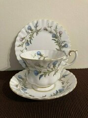 Royal Albert produced the Brigadoon pattern, featuring a blue and purple thistle on white porcelain with gilt edging, between 1963 and 2001. This trio features one Montrose-shaped teacup, one saucer and one 16cm (6.25 in) tea plate. All three items are in excellent condition, without any chips, cracks or crazing. They have always been hand washed and the gold edging is still very strong, with no evidence of fading. Eight trios available (£8.65 each). Cash payment and collection from Clapham area required