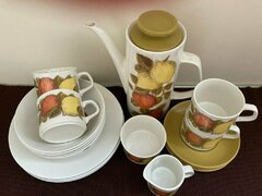This cheerful china set manufactured by J&G Meakin Studio comes in a bold design of oranges and lemons with matching mustard yellow coffee pot lid and saucers. The set consists of a tall coffee pot (24.5 cm high, including the lid), sugar bowl and milk jug, four cups and saucers, four cereal bowls (16 cm diameter) and four plates (23 cm diameter). All the pieces are in very good condition, with no chips, cracks or crazing. Would make an ideal starter kit for someone setting up home for the first time.