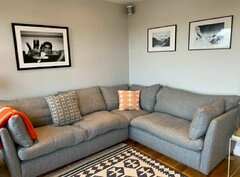 1. Selling a British handmade L shaped sofa in a grey wool fabric. All cushions are made from duck down, and the sofa has a wooden frame. The sofa is from F&P interiors, and is the Ashurst model. They can facilitate recovering if required. The sofa is in good condition with a few minor tears on cushions and from a non-smoking home. The cushions have removable covers. RRP is £9,750, selling for £1,750. Long side is 257cm long, and the short side is 215cm long. It is 84cm deep and 73cm high.