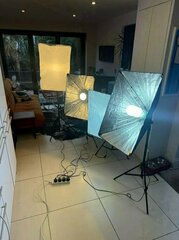 7. £100 Softbox Lighting Kit LED Photography Vevelux x 4 lights & stands & backdrop bar 2 x Velevux LED lights 2 x generic tube lights 4 x stands 4 x diffuser screens (only 2 on show) 1 x backdrop bar extendable One of the inner spars on one of generic umbrella-like boxes has come away but wedges into place to open as normal With travel bag and sleeves Worth over £200 new