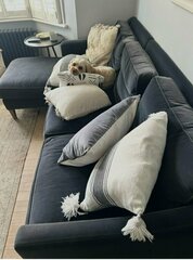 This has been well used and does come from a house with a dog - the cushions and frames are still in good condition but the fabric has some sun damage and there is general wear and tear but still very comfy. The first photo is the most recent, the second one was when it was quite new so it is not as dark anymore, 3rd pic has full measurements