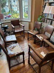 2. Lovely classic antique chairs which work (!) but in need of repair. 2 carvers plus 4 others. Leather damaged so potential renovation project for someone with right skills! Can send other photos. Just £100 ONO.