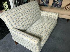 M&S fitted upholstered two seater sofa. Stylish in very clean (no pets) and quite presentable. Some slight wear at the end of the right armrest and splits in the centre of the main cushion, both as depicted. (cushions not included)
