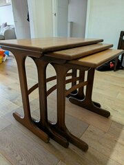 Original GPlan nesting tables in 3 sizes - £90 Large L56cm x W41cm x H52cm Medium L46cm x W38cm x H50cm Small L38cm x W35cm x H47cm On the Large and Medium tables, the bar between its legs needs to be glued back into place (see photo) but otherwise in very good condition. Collection from SE22, near Picturehouse cinema