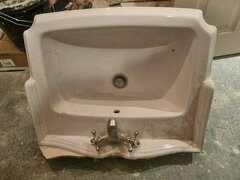 This wash basin is in excellent condition but no longer required. There is a single hole for the taps (traditional) which are included. The plug hole is of the push variety, whilst the back/upstand part of the basin curved into a top of heart shape.