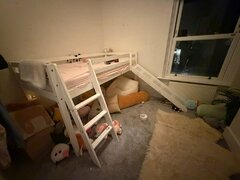 White wooden desk single bed, on raised legs, with mattress and a slide!! Going free to anyone who can collect All disassembled and ready to collect all as per picture and in good condition. the only thing is one of the pins on one of the legs got a bit jammed when taking it apart (see pics) but am sure it’s very fixable. all fittings bolts and pegs in a bag collection from St Aidans Road.