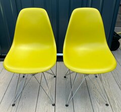 Two mustard colour Genuine Eames DSR chairs manufactured by Vitra. Heavy plastic seat with chrome legs, bought from John Lewis in 2018. In very good condition and sturdy, showing only a few very minor marks consistent with use (see photos). £150 for the pair. Also selling (in a separate listing) 2 of the same chairs in Ocean colour (which is close to teal). Will accept £280 for the 4. Measurements : Height 83cm Seat height 45cm Width 46cm