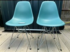 Two Ocean colour (close to teal) Genuine Eames DSR chairs manufactured by Vitra. Heavy plastic seat with chrome legs, bought from John Lewis in 2018. In very good condition and sturdy, showing only a few very minor marks consistent with use (see photos). £150 for the pair. Also selling (in a separate listing) 2 of the same chairs in mustard colour. Will accept £280 for the 4. Measurements : Height 83cm Seat height 45cm Width 46cm Depth 55cm