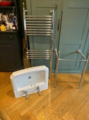 1. This bathroom suite is about 18 months old and is being replaced as part of house refurbishment. Traditional victorian sink available 58cm wide and 48cm deep. Sits on a chrome stand which measures 48cm high and 42cm deep. Chrome towel rail measures 1m 27cmn and 50cm wide. Both in good condition. Happy to split if only one needed. PM me if interested.