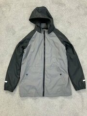 Grey and black hooded jacket, raincoat, fleecy lined, with front zip and pockets.
