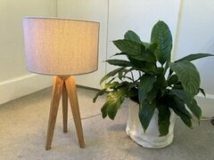 Lovely, wooden, tripod lamp with long legs + large, round gold bulb and pale grey, herringbone lampshade. £15