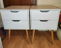 Identical bed side tables. Good condition. There is slight damage to one table, which is shown in picture otherwise good condition. Selling for £30 for the pair. Ideally would like to sell together or £20 for one.