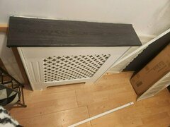 White radiator cover. Small no measurements. The top has been covered with Dc fix, will need to be painted or recovered, slight marks.