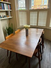 For sale £450 West Elm Mid-Century Modern Extendable Dining Table in Acorn: Solid eucalyptus legs & frame; engineered wood top with walnut veneer.