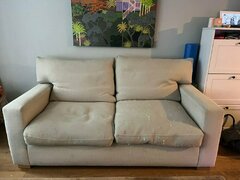 We’ve had it for quite a few years so it is a bit grubby as expected, but has removable covers on the cushions that can be cleaned. The inner bag of down feathers has burst on the right hand side, but it could be recovered and put back inside the cushion cover. We’ve just had a blanket over it to sit on which has been fine.